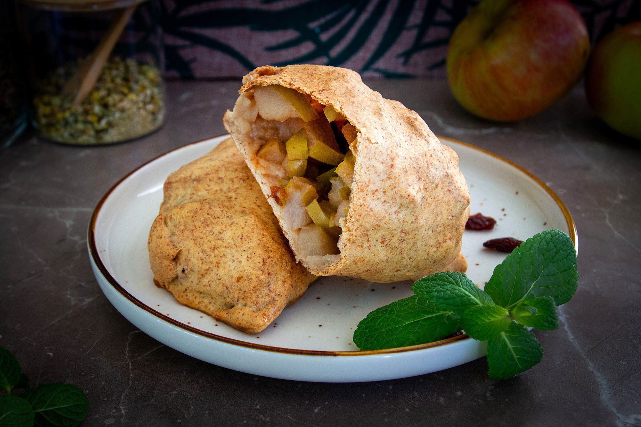 тесто: интегральная и белая мука, кероб, ваниль, масло подсолнечное; начинка: яблоко, изюм